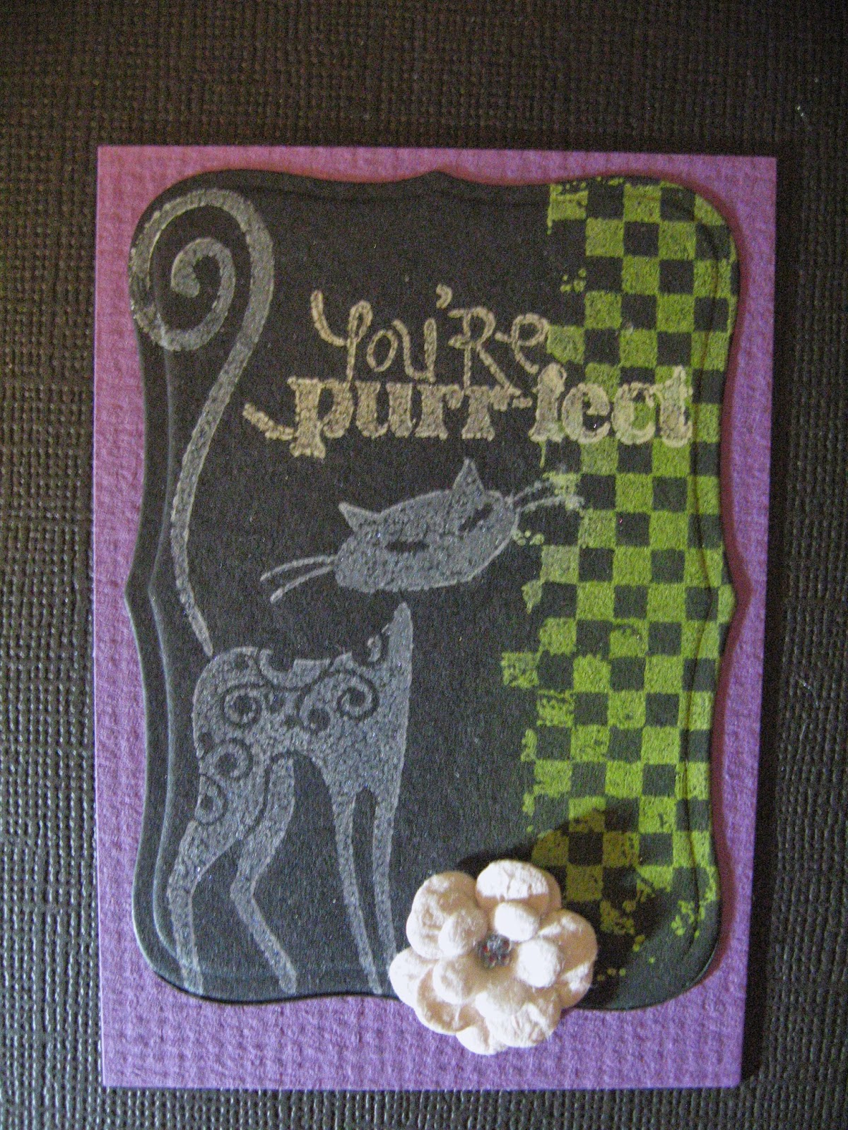 I cut black cardstock into 2 1/4 x 3 1/4 inch rectangles because I wanted to diecut them and mount on 2 1/2 x 3 1/4 inch purple cardstock to get the ATC size. Next I stamped a portion of the block pattern from Tim Holtz Stampers Anonymous Grunge Cirque cling set in Moonlight white. Using a brush, I dusted some green chalk from a chalk watercolor set over the ink. I let it dry for a minute or two and then rubbed over the image with a piece of flannel just to pick up extra dust and burnish the color down slightly. Using that same method and letting it dry between each step, I stamped the cat (Inkadinkado clear stamps Cat set) in Moonlight White. I used Pearl-ex this time in blue to dust over cat. I stamped the "You're Purrfect" from a Studio G clear stamp set and then used a gold Pearl-ex to color that.
