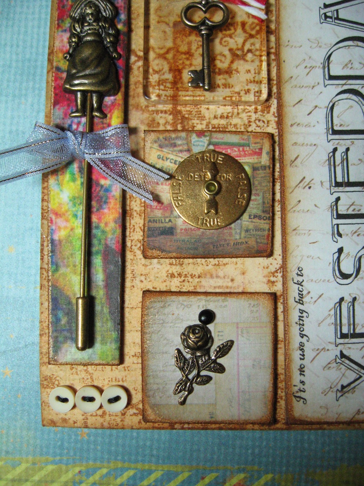 Continuing on making my 12 Tags of 2014, and now up to May. This one took me a while as I was trying to make every item fit in with the theme I picked...Alice in Wonderland. I used the techniques as described on Tim Holtz's blog, but added some details of my own. I didn't have a Shadowpress embossing folder, so once I had the quote from Alice in Wonderland arranged to my liking in a word processing program, I ran a sheet of preprinted paper through my printer. I then glued all the papers and charms I had gathered together onto a tag that I did using the Distress background technique. I used Ranger's Glossy Accents as it works on metal, paper, and plastic as well.